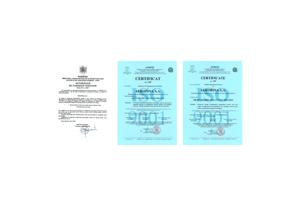 Accesează aici documentele oficiale AEROFINA, precum certificate, autorizații și standarde de management al calității, care atestă conformitatea și profesionalismul companiei.